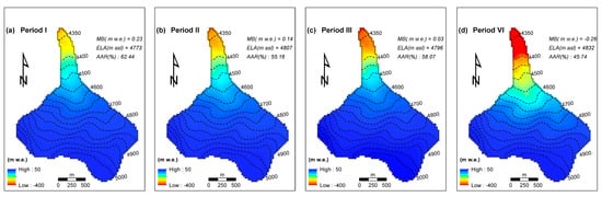 The spatial mean annual mass balance (MB) variation during Period I (1957–1969, a), Period II (1970–1979, b), Period III (1980–1991, c), and Period VI (1992–2013, d).