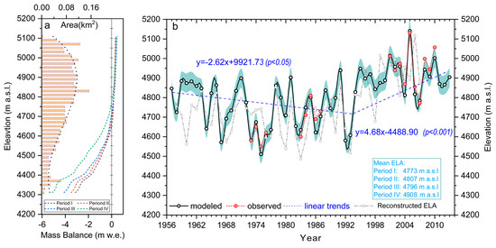 As Figure 9 shows, the modeled ELA agrees well with those derived from glacier mass balance measurements from three discontinuous periods (1972–1975, 1983–1986, and 2001–2011) and the earlier rebuilt results [55]. Both reconstructed and observed results implied that the annual variability of ELA is considerable in Qiyi Glacier. During the 1970s and 1980s, ELA’s value was just 4600 m and 4670 m, respectively [13]. By 2002/2003, it had risen to about 4970 m with the increased air temperature; by 2005, the ELA had dramatically retreated to 5131 m [15], which is quite close to its summit altitude of 5145 m. Throughout the study period, the lowest and highest ELA values differ by ca. 700 m (Figure 9b). The mean value of ELA in each positive stage (Periods I to III) was 4773, 4807, and 4798 m a.s.l, respectively. While the average ELA has increased to 4908 m in the negative mass balance (Period IV) and will continue to rise in the coming future under whatever climate scenario it is.