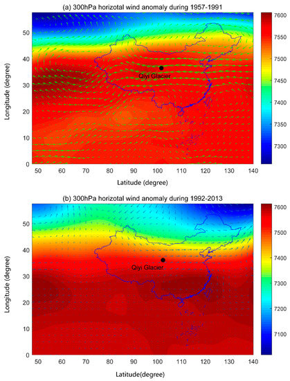 Period I (1957–1969), the mass balance dramatically increased with a linear rate of 0.032 m w.e. a−1 (p < 0.05), indicating the response of Qiyi Glacier to the global air temperature decreasing and precipitation increasing began in the late 1950s. Period II (1970–1979), although the mass balance was still positive with a rate of 0.027 m w.e.a−1 (p < 0.01), the increase rate began to slow down at this stage. However, the maximum mass gained during the mid-1970s was captured by both reconstructed and observed series [13,15], dominated by the relatively cold climate during these years. In Period III (1980–1991), the mass balance remained slightly positive with a rate of 0.008 m w.e. a−1 (p < 0.05), but the increasing rate is substantially lower than in Periods I and II, revealing the glacier has approximately entered a state of zero equilibrium. From Periods I to III, the increasing trend of SMB gradually slows down. Meanwhile, the glacier SMB experienced a strongly positive, relatively higher positive, and slightly positive stage. Furthermore, finally, the mass balance trend abruptly shifted from positive to strongly negative since 1992.
