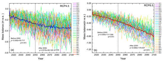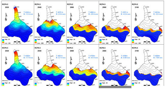 Despite the fact that the precipitation could compensate for parts of the melting effect caused by temperature rising, the temperature increased at a higher rate of 0.068 °C a−1 (p < 0.001) for RCP 8.5 in the second half-century, whereas the temperature is relatively stable with a slightly increased rate of 0.014 °C a −1 (p < 0.001) for RCP 4.5 (Figure 3a,c). Similarly, the precipitation increased with a rate of 0.22 mm a−1 for RCP 8.5, while the rate for RCP 4.5 was only 0.09 mm a−1 (Figure 3b,d). Therefore, the mass loss in RCP 8.5 is almost twice as much as that in RCP 4.5 from 2014 to 2100 (Figure 13 and Figure 14). As a result, it leads the terminus elevation to retreat to a higher elevation in RCP 8.5 than in RCP 4.5 for the same periods. After all, the terminus elevation of Qiyi Glacier will at least go up to 4810 m a.s.l, which was higher than our calculated multi-year average ELA (4804 m a.s.l.) and the previous estimated mean annual ELA (4749 m. a.s.l.) from 1957 through 2013 [13].