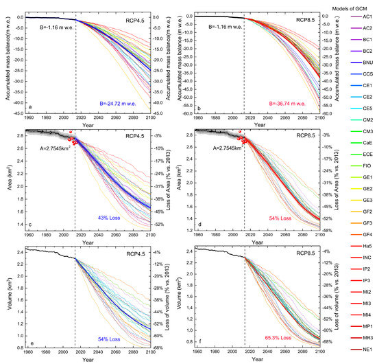 The accumulated mass balance (a,b), area (c,d), and volume (e,f) of the Qiyi glacier during 1957–2100 under RCP 4.5 and RCP 8.5 climate scenarios by using multi-model outputs of GCM. The black balls in (c,d) refer to the observed areas of the Qiyi glacier; the red balls in (c,d) refers to the areas gained from Landsat EM+. The thick lines in the (a–f) indicate the mean values.