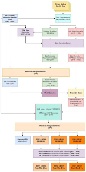 The methodology used in this study is summarized in the flowchart (Figure 3). The CMIP6 data collected required pre-processing since each model’s data were on a different grid (Table 1). To ensure consistency, all models were interpolated to the same spatial scale as the IMD gridded observed data. The EQM bias correction method was utilized to remove any biases in the CMIP6 model data, and the same correction factor was then applied to the SSP future scenarios of the CMIP6 data. To analyze decadal changes in the drought index over time, the IMD observed data were used to compute the drought index (SPI) for various time periods (1951–1980, 1961–1990, 1971–2000, 1981–2010, and 1991–2020). Additionally, the SPI was computed for the ensemble product of selected models of the CMIP6 historical data and all SSP future scenarios periods, including the near future (2023–2048), mid future (2049–2074), and far future (2075–2100).