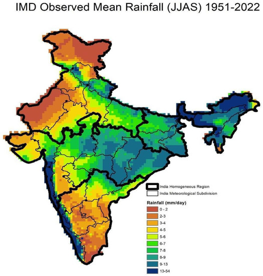 The spatial distribution of the mean (June to September) rainfall of the past 72 years (1951–2022) is shown in Figure 4. Evidently, as documented by several previous studies [36,49], the regional pattern of the monsoon season rainfall climatology is quite congruent with the rainfall data. A large variability has been observed in the spatial distribution of the monsoon rainfall (June to September) throughout the country. The met subdivisions of core monsoon regions, i.e., East and West Madhya Pradesh, Chhattisgarh, Odisha, and Vidarbha, Northeast India subdivisions, and Western Ghat subdivisions i.e., Konkan and Goa, Coastal Karnataka, and Kerala, experience substantial monsoon rains with a rainfall of 8 mm/day or more during June to September. The Western Ghat and northeastern regions experience considerable rainfall because of their hilly topography, which condenses moisture-laden wind flow and causes precipitation there. As we move towards the northwest direction from the monsoon core region, the rainfall amount is decreased. The low and vulnerable rainfall zones are West and East Rajasthan, Rayalaseema, N. I. Karnataka, S. I. Karnataka, Tamil Nadu, and Jammu and Kashmir with a rainfall less than 4–5 mm/day during the monsoon season [6,50,51].