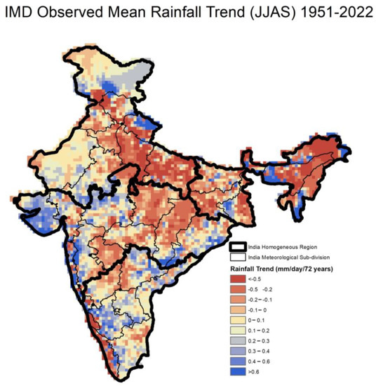 The IMD mean rainfall linear trend (JJAS) 1951–2022 (Figure 5) clearly shows that there is a significant decrease in monsoon rains over the monsoon core regions, specifically the met subdivisions East and West Uttar Pradesh, East Madhya Pradesh, Chhattisgarh, and Jharkhand. Saha et al.’s (2022) [44] study is also congruent with our findings on a decreasing trend of monsoon low pressure system frequency as well as a decrease in monsoon rainfall over the main monsoon core regions [52,53].