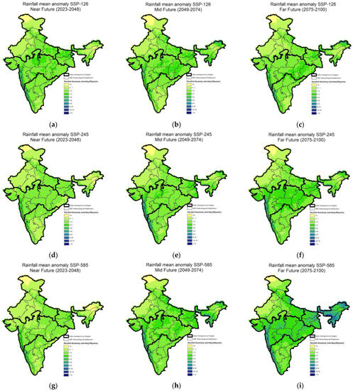 CMIP6 bias-corrected MME ensemble mean rainfall anomaly with reference to historical period (1989–2014) (a) mean rainfall anomaly SSP-126 Near future (2023–2048), (b) mean rainfall anomaly SSP-126 mid future (2049–2074), (c) mean rainfall anomaly SSP-126 far future (2075–2100), (d) mean rainfall anomaly SSP-245 near future (2023–2048), (e) mean rainfall anomaly SSP-245 mid future (2049–2074), (f) mean rainfall anomaly SSP-245 far future (2075–2100), (g) mean rainfall anomaly SSP-585 near future (2023–2048), (h) mean rainfall anomaly SSP-585 mid future (2049–2074), and (i) mean rainfall anomaly SSP-585 far future (2075–2100).