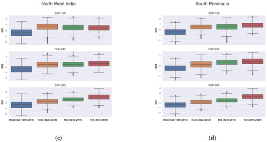CMIP6 SSP scenarios 12-month Standard Precipitation Index (SPI) boxplot at homogeneous region level (a) Central India, (b) East and Northeast India, (c) Northwest India, and (d) South Peninsula India for near, mid, and far future.