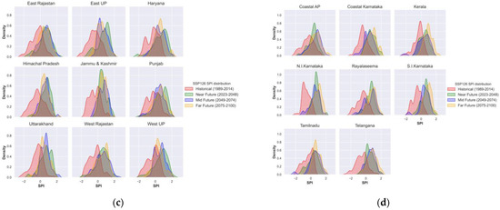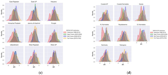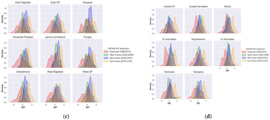 Homogeneous regions such as Northwest India and South Peninsula India are likely to be impacted more than the Central and Northeast homogeneous region. Except Himachal Pradesh and Jammu and Kashmir, all subdivisions of Northwest India are vulnerable to severe drought events in the near future, especially Haryana, Punjab, West UP, and West and East Rajasthan (Figure 13). Figure 10c, Figure 11c and Figure 12c show the broader base of the probability density curve for both wet and dry, which indicate the erratic pattern of extreme events in the near future over the subdivisions of North West India. Figure 9c clearly illustrates that the frequency of wet events increases with the scenarios SSP-126, SSP-245, and SSP-585, and from the near to far future, similar to Central and North East India. South Peninsula subdivisions Coastal AP and Tamil Nadu are more susceptible to the drought events in the near future under all SSP scenarios and are likely to shift towards the wet extreme events in the mid and far future (Figure 14). Figure 10c, Figure 11c and Figure 12c show that the frequency of wet events is two-fold from the near future to mid future under the SSP-245 scenario.