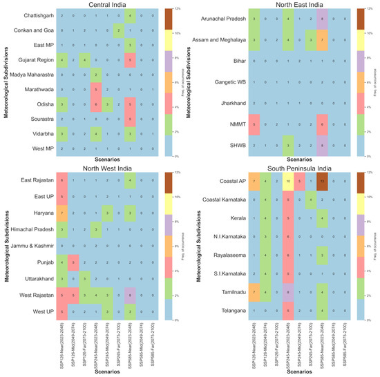 A main monsoon core region, the Central India homogeneous region’s SPI index median is most likely to shift towards the wet side with some extreme wet events and moderate to severe dry events in the near future under SSP-126, SSP-245, and SSP585 scenarios (Figure 9a, Figure 10a, Figure 11a, and Figure 12a). If we drill down to the subdivision level, the frequency of occurrence of dry events (Figure 13) is likely to be moderate to severe drought frequency in the near future under the SSP-126 climatic scenario which is also likely to decrease in the mid and far future. Wet event frequency is comparatively high for West MP in the near future under the SSP126 scenarios (Figure 14). The wet frequency is likely to increase with extreme SSP scenarios in the mid and far future for all subdivisions of Central India. The East and Northeast India homogeneous regions are also in line with the Central India region and are likely to increase in wet event frequency in the mid and far future. The PDF plot (Figure 10, Figure 11 and Figure 12) shows the more erratic SPI index distribution with the extreme SSP scenarios for the mid and far future.