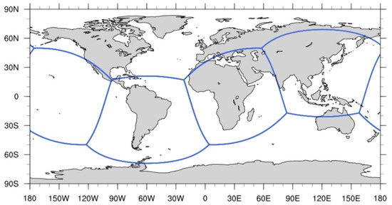 The tile arrangement of CWB-FV3GFS in which the blue lines divide the global grids into six tiles. One tile is centered at Taiwan.