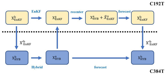 The hybrid four-dimensional ensemble-variational (4DEnVar) data assimilation system developed by NCEP [23,24] was implemented at the CWB. This system is an extension of the hybrid three-dimensional ensemble-variational (3DEnVar) data assimilation [25,26,27,28]. The data assimilation procedure is shown in Figure 2. The use of a coarser resolution for the ensemble forecasts in this study may speed up the DA process. In the 4DEnVar, the temporal evolution of the background error covariance can be approximated by the covariances of ensemble perturbations at discrete times. The background error covariance matrix is a weighted average between the static background error covariance in the variational system and the flow-dependent background error covariance from the EnKF ensemble members :