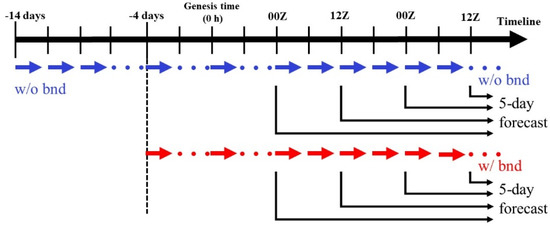 The assimilation strategy of this study where blue and red arrows indicate data assimilation cycles without and with RO bending angle observations. A period of 4 days before the typhoon genesis time is chosen for starting the RO assimilation. Main forecasts are conducted with a period of 5 days after DA.