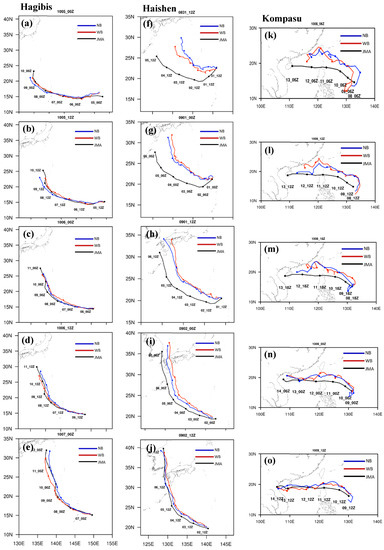Figure 5 shows the 120 h forecast results of Hagibis, Haishen, and Kompasu. The forecasted tracks for Hagibis at different initial times in general are in good agreement with the Japan Meteorological Agency (JMA)’s best track. In particular, the northward turning of Hagibis at later stages is also well captured with the final track errors less than 200 km (Figure 5c–e). Although Hagibis in WB (with RO data assimilation) forecasts initialized from 0000 UTC and 1200 UTC 5 October 2019 moves slower, its north turn was also well simulated and close to the JMA best track (Figure 5a,b). At the two earlier forecasts, the tracks of NB (without RO data assimilation) were improved in WB, but their performances were mixed for later forecasts. The track forecasts for Haishen and Kompasu, however, showed larger errors from earlier times as compared to Hagibis. Appreciable northward or eastward deviation was produced for Haishen, regardless of use of the RO data (Figure 5f–j). Specifically, the RO data improved the track forecast of the first run (Figure 5f) but degraded the track forecasts of all later runs (Figure 5g–j). The performances of track forecasts are somewhat mixed for Kompasu which is the weakest typhoon (with the maximum wind speed of only 30 m s−1) among the five typhoons. Because of its weak intensity, Kompasu was found to have larger initial position errors than the two other typhoons (Figure 5k–o). Furthermore, Kompasu’s tracks were more meandering than Hagibis and Haishen for both WB and NB. We also did not identify a clearly positive RO impact on the Kompasu’s track forecasts at different initial times, except for the last forecasts that were slightly improved, as seen in Figure 5o.