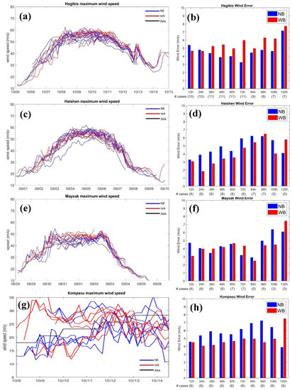 Figure 7 shows the forecast errors of maximum wind speed (Vmax) at 10 m height for the four typhoons. We found that all the wind intensity errors at different forecast times were less than 8 m s−1. For the three intense typhoons (Hagibis, Haishen, and Maysak), the forecasted intensities were in good agreement with the best track data in magnitudes and trends (Figure 7a,c,e). For Hagibis, the wind speed error for WB was smaller than NB in the first 24 h, but became larger after 24 h. For Maysak, the Vmax forecasts for WB were improved in the first 12 h and 84–108 h, and the largest improvement appears at the later stage. It is also noted that a large improvement of about 2 m s−1 at the earliest stage resulted from the RO data assimilation. For Haishen and Kompasu, the wind speed error for WB was significantly reduced at all the forecast times, except for the 120 h. For these two cases, assimilation of the RO data greatly improved the intensity forecasts.