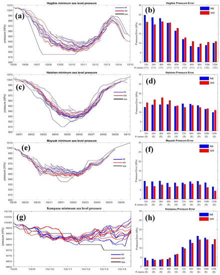 Figure 8 shows the forecasted minimum sea-level pressure (MSLP) of the typhoon with time for the four typhoons. For the two intense typhoons (Hagibis and Haishen), the deepening rate of MSLP was slower than the JMA best track data in the first three days. For example, near the first occurrence of the lowest pressure of Hagibis (Figure 8a), 1200 UTC 07 October, the forecast gave the MSLP error of about 40 hPa compared with the best track data. Although the forecast obtained the lowest pressure at the later stage, it still had the pressure error of about 10 hPa. For both intense Hagibis and Haishen, the occurrence of the lowest pressure for WB and NB was delayed about two days and one day, respectively, compared with the best track data. The simulated MSLP trends for Hagibis, Haishen, and Maysak were similar, but intense. Hagibis and Haishen were more underpredicted than Maysak prior to the strongest development. The forecasted lowest pressure was about 30 hPa higher than the observed peak intensity at 1200 UTC 4 September for Haishen, but only 15 hPa higher at 0000UTC 1 September for Maysak. For the weaker Typhoon Kompasu, the MSLP errors in the first three days were much smaller than Hagibis, Haishen, and Maysak, but indeed are larger afterward. The lowest MSLP of Kompasu is produced at 0000 UTC 11 October, about two days earlier than the observed at 0000 UTC 13 October. For Hagibis, MSLP errors for WB are smaller than NB in the first 36 h but become larger afterward. On the contrary, MSLP errors for WB are larger than NB in the first 60 h for Haishen and are smaller than NB in 72–96 h and larger than NB at later times. For Maysak, the MSLP errors for WB are considerably smaller than NB at all the forecast times with the largest improvement up to 3–4 hPa. For Kompasu, the MSLP errors in the first 60 h are rather small within 7 hPa, and WB showed some improvement in 72–108 h. Assimilation of the RO data produced fewer positive impacts on intensity forecasts for MSLP, as compared to the intensity forecasts for maximum wind speed (Vmax).