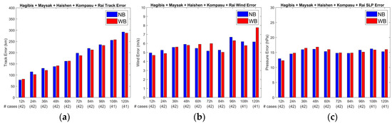 (a) Track errors at different forecast times averaged for the five typhoons (Hagibis, Maysak, Haishen, Kompasu, and Rai) for NB (blue) and WB (red), (b) as in (a), but for maximum wind speed errors, and (c) as in (a) but for minimum sea-level pressure errors. The total runs at different forecast times are indicated by the number included in the parentheses below each panel.