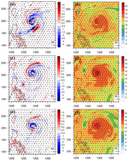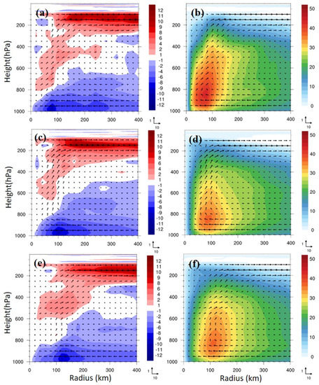 Figure 11 shows the azimuthal-mean fields for Maysak at 1200 UTC 30 August 2020. There is strong inflow at low levels in radii of about 60 to 280 km in the NCEP FNL analysis, with the maximum inflow speed near the radius of 80 km (Figure 11a). The inflow intensified inward and became shallower in the eyewall, which was accompanied by the updraft development tilting outward with height. Near the top of the developed eyewall updrafts, intense outflow over 10 m s−1 was produced outside the radius of 100 km. The associated tangential wind was also strong, close to 50 m s−1 in the lower eyewall region (Figure 11b). For WB, the simulations bore resemblance to the NCEP FNL analysis, except with a weaker inner-vortex core but stronger upper-level eyewall updrafts in a deeper inflow layer (Figure 11c,d). This is consistent with Figure 10 that shows stronger eyewall updrafts in the more intense vortex core at lower levels in the FNL analysis. On the other hand, the simulations for NB (without the RO data assimilation) showed less developed eyewall updrafts that are displayed more outward (Figure 11e,f). The inner-vortex core is also located more outward than the FNL and WB, but with similar intensity as WB. The further outward eyewall updrafts in NB may result from the outer formation of the maximum inflow by about 20 km and 50 km in comparison to WB and FNL, respectively. Overall, the simulations for WB have more consistent features in common with the FNL analysis than NB.