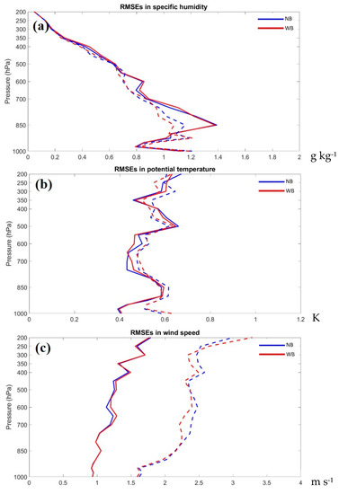 RMSEs of (a) specific humidity of water vapor (g kg−1), (b) potential temperature (K), and (c) horizontal-wind speed (m s−1) verified against the NCEP FNL analysis over a 20°-by-20° region centered at the typhoon center at 1800 UTC 24 August 2020 (solid lines) and 1200 UTC 30 August 2020 (dashed lines) for Maysak. The results for NB and WB are shown in blue and red lines, respectively.