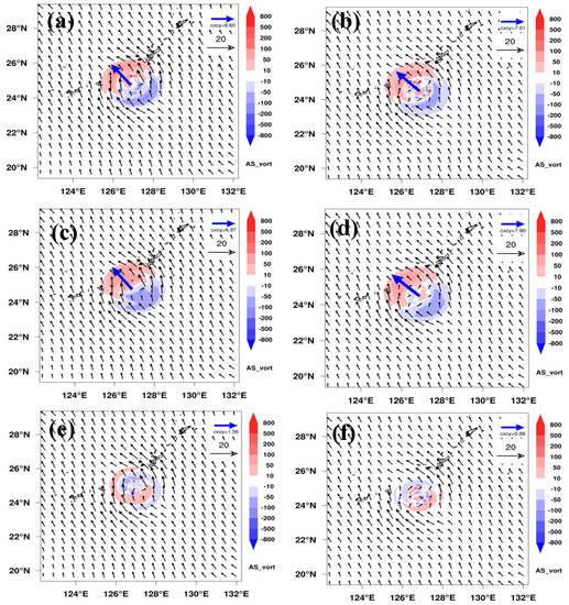 We applied the regression method (Wu and Wang 2000) [30] for the vorticity budget to explain the movement of the simulated vortex for Maysak as employed before [31]. The wavenumber-one vorticity budget terms, averaged in 1–8 km height, for the inner typhoon and the regressed moving speed (m s−1) induced by different physical processes in the budget at 1200 UTC 30 August 2020 are shown in Figure 13. Both vertical vorticity advection and the solenoidal term are much smaller and, thus, are not included in the figure. The induced moving speed of the vortex for WB was slightly slower and less westward than NB (Figure 13a,b), which was in response to their dominant horizontal vorticity advection (Figure 13c,d). The total translation velocity induced by the net budget was in agreement with the wavenumber-one asymmetric flow surrounding the inner vortex. The stretching effect from the divergence term was much weaker than the horizontal vorticity advection, but with counteracting southward and southeastward movement in WB and NB, respectively (Figure 13e,f). This may imply that the vortex movement was much less influenced by the effect of diabatic heating produced by the upward motions of the eyewall due to the horizontal convergence.