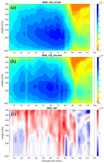 Various analysis results after DA may be produced by the RO data, thus affecting the forecast performances [12]. Herein, we give such an example. Figure 16 shows that the analysis for Typhoon Hagibis was degraded by the additional assimilation of the RO data for potential temperature above 850 hPa, but significantly improved in the wind field below about 550 hPa. The water vapor analysis was relatively less modified by the RO assimilation for this case (figures not shown). This large error reduction in wind analysis led to a considerable reduction in track forecast errors (Figure 16c,d), indicating that the wind analysis is more important for track forecasts in this case. Note that RO data can only contribute to the impacts on wind analysis in DA via dynamic adjustment due to the correlation with thermodynamic variables used in the nonlinear RO operator. This may also outline a difficulty in precisely relating the forecast performances to possible variables involved in the evolution of both track and intensity forecasts.