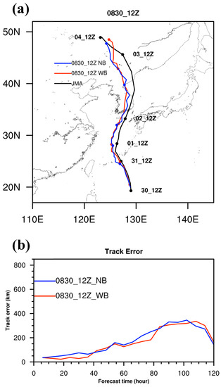(a) Tracks of WB (in red) and NB (in blue) and the best track of JMA (in black) starting from 1200UTC 30 August 2020 for Maysak. (b) as in (a), but for the track errors of WB and NB with the forecast time (hour).