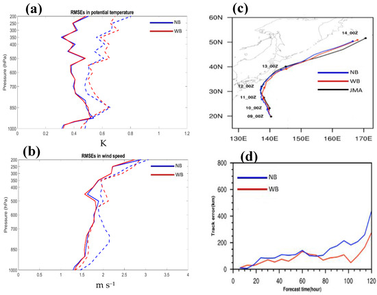 RMSEs of (a) potential temperature (K) and (b) horizontal-wind speed (m s−1) at 0000 UTC 2 October 2019 (solid lines) and 0000 UTC 9 October 2019 (dash lines) for WB (in red) and NB (in blue). (c) Typhoon tracks of WB (in red) and NB (in blue) and the best track of JMA (in black) starting from 0000 UTC 9 October 2019 for Typhoon Hagibis. (d) as in (c), but for the track errors (km) of WB and NB with the forecast time (hour).
