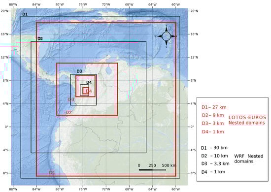 This work used outputs from the ECMWF and WRF model 3.7 to run LOTOS–EUROS. The WRF’s meteorology simulation is obtained using four nested domains, as shown in Figure 1, in a 3:1 relationship, including the entire Colombian territory and maritime.