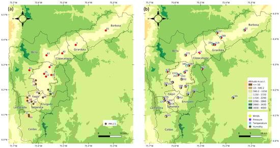 The locations of the sensors in the Aburrá Valley are shown for (a) the official PM monitoring network operated by SIATA and (b) the SIATA meteorological network, which includes sensors for wind, pressure, temperature, and humidity. The spatial distribution of the sensors is essential for accurately measuring and predicting air quality and meteorological conditions in the region.