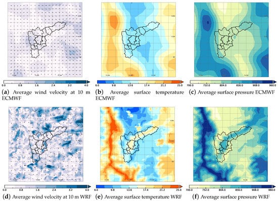 Figure 3a,d compare the average wind velocity at 10 m. The wind pattern seems smoother for the WRF condition than the ECMWF.