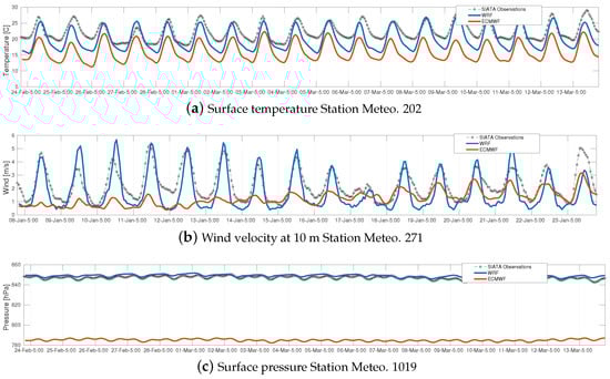 Figure 4 displays time-series plots for the daily cycle of surface temperatures (Figure 4a), wind velocity at 10 m (Figure 4b), and surface pressure (Figure 4c) for stations 202, 271, and 1019, respectively. Observe that both models underestimate the surface temperature. However, the underestimation in the ECMWF model is more significant.