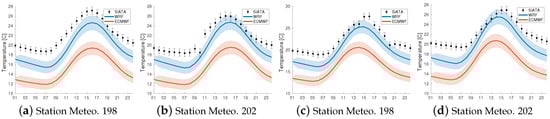 Evaluation of daily temperature cycle. Observed data against LOTOS–EUROS simulations with WRF and ECMWF in stations 198 and 202, period W1 (a,b) and period W2 (c,d).