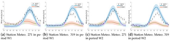 Evaluation of the daily wind velocity cycle. Observed data against LOTOS–EUROS simulations with WRF and ECMWF in stations 271 and 319, period W1 (a,b) and period W2 (c,d).