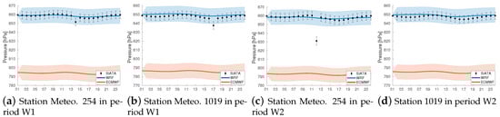 Similarly, Figure 7 shows the accuracy of the WRF model in representing the surface pressure observations in both periods and for the stations shown. Notable is that the surface pressure is an essential meteorological variable in atmospheric circulation and weather forecasting. Its accurate measurement and representation are essential for studying and understanding atmospheric dynamics and weather phenomena.