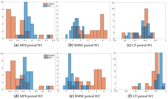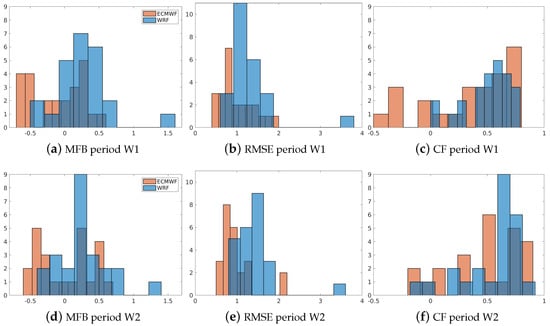 Comparison of error statistics for PM by LOTOS–EUROS employing meteorology from the ECMWF and WRF models for periods W1 and W2. (a–c) MFB, RMSE, and CF in W1, respectively. (d–f) MFB, RMSE, and CF in W2, respectively.