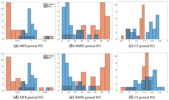 Comparison of the wind velocity error statistics between the ECMWF and WRF models for periods W1 and W2. (a–c) are MFB, RMSE, and CF in W1, respectively. (d–f) are MFB, RMSE, and CF in W2, respectively.