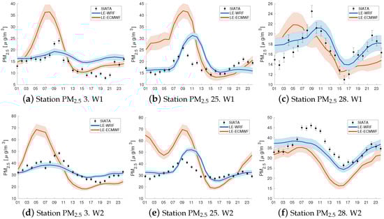 The daily cycle of PM by LOTOS–EUROS, using meteorology from WRF and ECMWF, is compared with observations in Figure 11. In this case, Figure 11a–c show the concentration in W1 for stations 3, 25, and 28, respectively. Similarly, Figure 11d–f show the concentration in W2 for the same stations using both ECMWF and WRF meteorology.