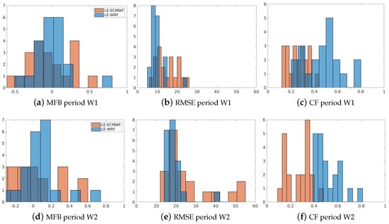 On the other hand, Figure 12b,e show that, on average, the deviations of the observations are smaller for WRF than ECMWF. Furthermore, the RMSE is more grouped for WRF around a value than in the ECMWF; this is, it is more consistent with the results generated.