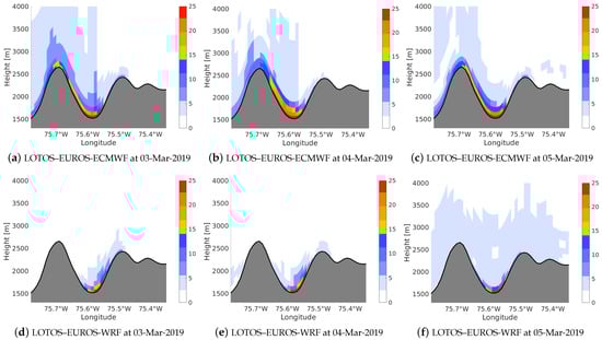Aburrá Valley vertical profiles. (a–c) The vertical and surface PM daily mean for a high-concentration period using meteorology from ECMWF in LOTOS–EUROS at latitude N on 3–5 March. (d–f) The same for WRF data on the same days.