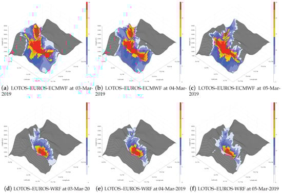 Comparison of the vertical and surface daily mean PM concentrations between the LOTOS–EUROS output using meteorology from the ECMWF and WRF models during three days of a high-concentration period. (a–c) The results for 3–5 March 2019, respectively, when using ECMWF input, (d–f) The results for the same dates when using the WRF input.