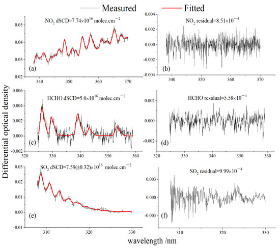 Examples of typical DOAS fits for NO2 (a), HCHO (c) and SO2 (e) at 30° elevation angle. Residuals for NO2 (b), HCHO (d) and SO2 (f) are given in the corresponding subfigures. The red and black curves indicate the fitted absorption structures and the derived absorption structures from the measured spectra, respectively.