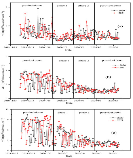 The observation period was from December 2019 to May 2021. The period from December 2019 to May 2020 was divided into four phases according to traffic control and compared with the corresponding period in 2021. Figure 3 shows the time-series data of the daily mean VCDs for NO2, HCHO and SO2 during the observation period in 2020 and 2021. Furthermore, the observation results for NO2, HCHO and SO2 showed obvious seasonal and monthly variation trends. Table 2 gives the monthly mean values during the observation period for the three gases. Since there were only nine measurement days in May, the monthly mean value for May was not calculated. The daily mean concentrations of NO2, HCHO and SO2 in winter in 2020 were higher than in spring, and the daily averaged values in winter were 1.06 × 1016 molecules/cm2 for NO2, 2.10 × 1016 molecules/cm2 for HCHO, and 4.68 × 1016 molecules/cm2 for SO2, which were 1.2, 1.8 and 2.1 times greater than those in spring, respectively. The maximum monthly mean values of the three gases occurred in December, while the minimum monthly mean values of NO2 occurred in February and the minimum monthly mean values of HCHO and SO2 occurred in April.