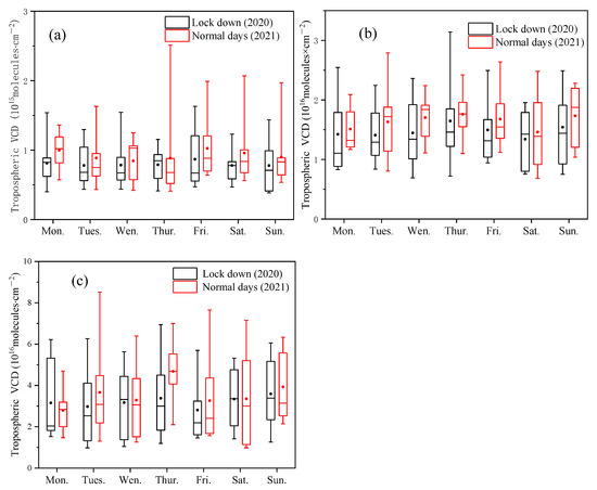 Weekly cycles of (a) NO2, (b) HCHO and (c) SO2 VCDs observed over Huaibei during the lockdown period and normal days.