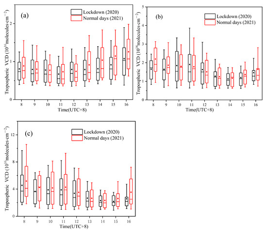 Averaged diurnal variations of (a) NO2, (b) HCHO and (c) SO2 VCDs observed over Huaibei during the lockdown period and normal days.