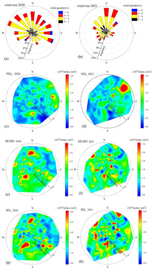 Wind roses in (a) 2020 and (b) 2021. Dependence of (c,d) NO2, (e,f) HCHO and (g,h) SO2 VCDs on wind directions and wind speeds in 2020 and 2021.