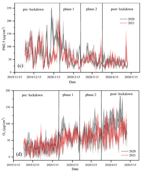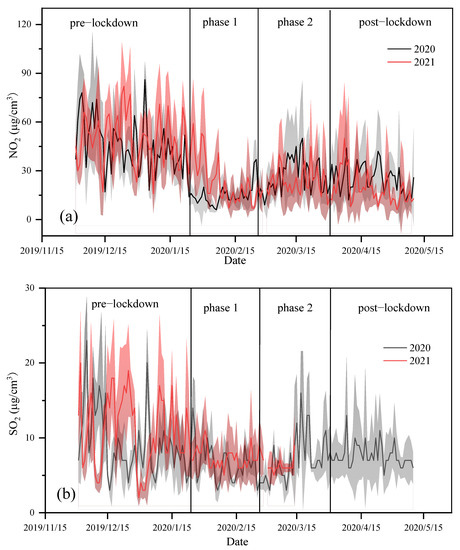 Time-series data of in situ instrumental measurements of NO2, SO2, PM2.5 and O3 concentrations for 2020 and 2021 are given in Figure 8. SO2 data will be missing after 15 March 2021. The average concentrations of NO2, SO2, PM2.5 and O3 in phase 1 during lockdown in 2020 were 15, 7, 69 and 67 µg/m3, respectively. Compared with 2020, the average concentrations of NO2 and SO2 in phase 1 in 2021 increased by 59 and 11%, respectively, and PM2.5 and O3 decreased by 15 and 17%, respectively. In 2021, the near-surface concentrations of NO2 and SO2 increased due to traffic and industrial emissions. The decrease in PM2.5 and O3 may be related to primary aerosol emissions and atmospheric photochemical reactions.