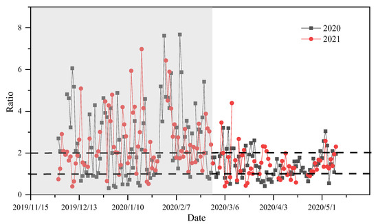Daily average HCHO/NO2 ratio at Huaibei in 2020 and 2021.