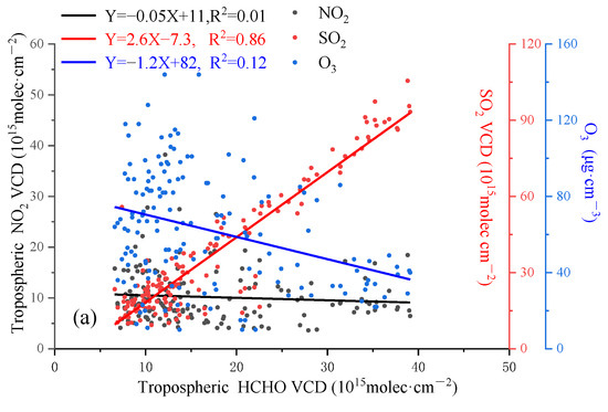 Nitrogen dioxide (NO2), formaldehyde (HCHO) and sulfur dioxide (SO2) are important atmospheric constituents that play crucial roles in tropospheric chemistry. NO2 is involved in the formation cycle of tropospheric ozone [1,2]. NO2 and SO2 can generate nitrate and sulfate particles by reacting with OH radicals. HCHO mainly comes from the oxidation of volatile organic compounds (VOCS) and industrial emissions. Primary emissions of HCHO are an important indicator of air quality in industrial areas [3,4]. HCHO has a short atmospheric lifetime and can be used to measure the local VOC content. NO2, SO2 and HCHO are important precursors to urban aerosols. Traffic, heating and industrial emissions significantly increase the background concentration of these gases in the urban boundary and near ground layers [5,6,7,8]. Recent studies have found that aerosol particles in large cities in China mainly come from secondary formation reactions [2]. It is important to obtain spatiotemporal distribution data of air pollutants through long-term observations to understand their sources and atmospheric photochemical reaction processes. As China’s urban traffic and industrial emissions have serious impacts on air quality, emission reduction plans were implemented to control pollution during the Shanghai World Expo (2010), the Asian-Pacific Economic Cooperation Conference in Beijing (APEC, 2014) and the G20 Summit in Hangzhou (2016) [9,10,11]. The air quality improved significantly during these events; however, it returned to previous levels soon after the end of these lockdown measures.