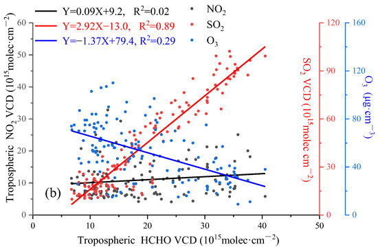 Scatter plots and linear regressions of daily average HCHO VCD measured by MAX-DOAS against NO2, SO2 VCD measured by MAX-DOAS and O3 measured by an in situ instrument in (a) 2020 and (b) 2021.
