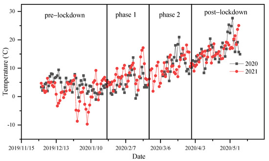 The variation of temperature (°C) from the weather station at Huaibei in 2020 and 2021.