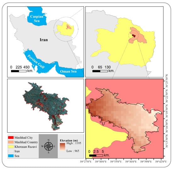 Presentation of study area; location of Khorasan Razavi province in Iran (top left), location of Mashhad country (top right), location of Mashhad city, together with its elevation image (bottom right), and false-color composite image of Mashhad City (bottom left) from Landsat 8 bands (3, 4, and 5) on 14 September 2019 (www.earthexplorer.usgs.gov, accessed on 30 July 2020).