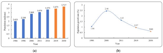 Changes in the population of Mashhad city in the period 1986–2030 (a), the available statistics are in blue and the predicted ones are in orange) and Mashhad city population annual growth rate (in percent) (b) for the same period (values for 2019 and 2030 were predicted, as marked in orange).